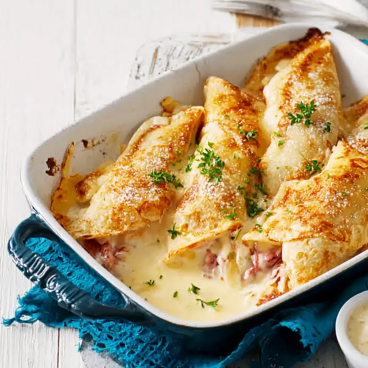 Gefüllte Pfannkuchen sind genau das richtige Gericht, wenn du Lust auf etwas Seelenwärmendes und trotzdem Raffiniertes hast. Die Kombination aus saftiger Füllung, würzigem Schinken und goldbrauner Käsekruste bringt Laune auf den Tisch – ob an Wochentagen oder für Gäste.