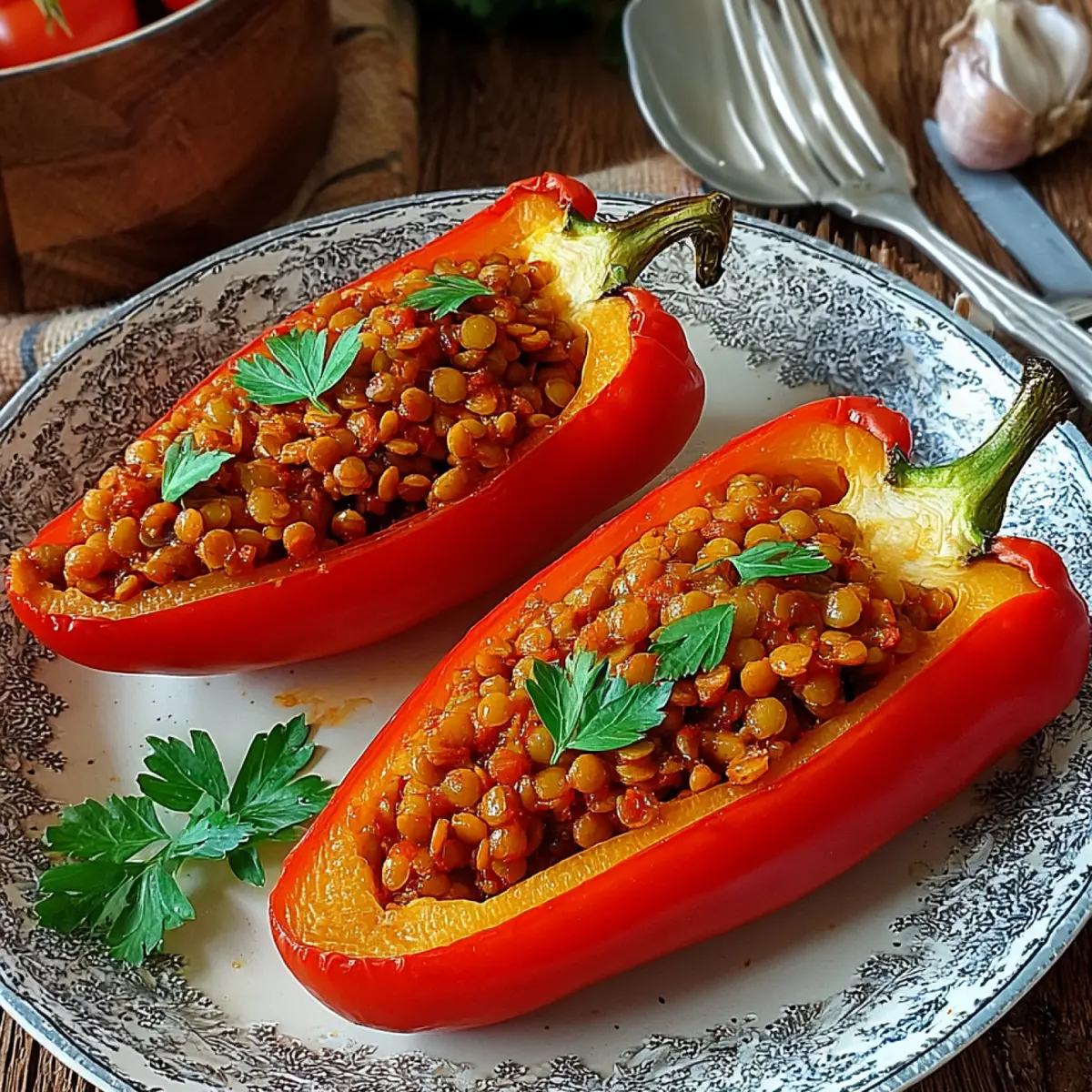 Die Magie dieses Essens steckt in den Kontrasten: Die Paprika sind außen zart geröstet und geben ihren süßlichen Geschmack ab, während die Füllung aus roten Linsen, Gewürzen und Tomatenmark für eine angenehme, fast cremige Mitte sorgt. Geräuchertes Paprikapulver, wenn du es verwendest, spielt mit einer leichten Räuchernote, die wunderbar mit Koriander oder frischer Petersilie harmoniert. Es duftet schon aus dem Ofen nach Knoblauch, Zwiebel und Kreuzkümmel – dabei ist das Gericht komplett pflanzlich und braucht weder Käse noch Fleisch, um Eindruck zu machen.