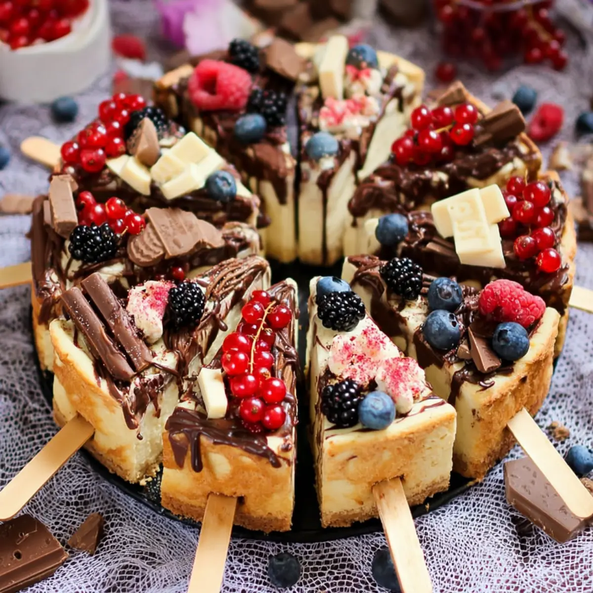 Käsekuchen am Stiel mit Schokolade und Beeren