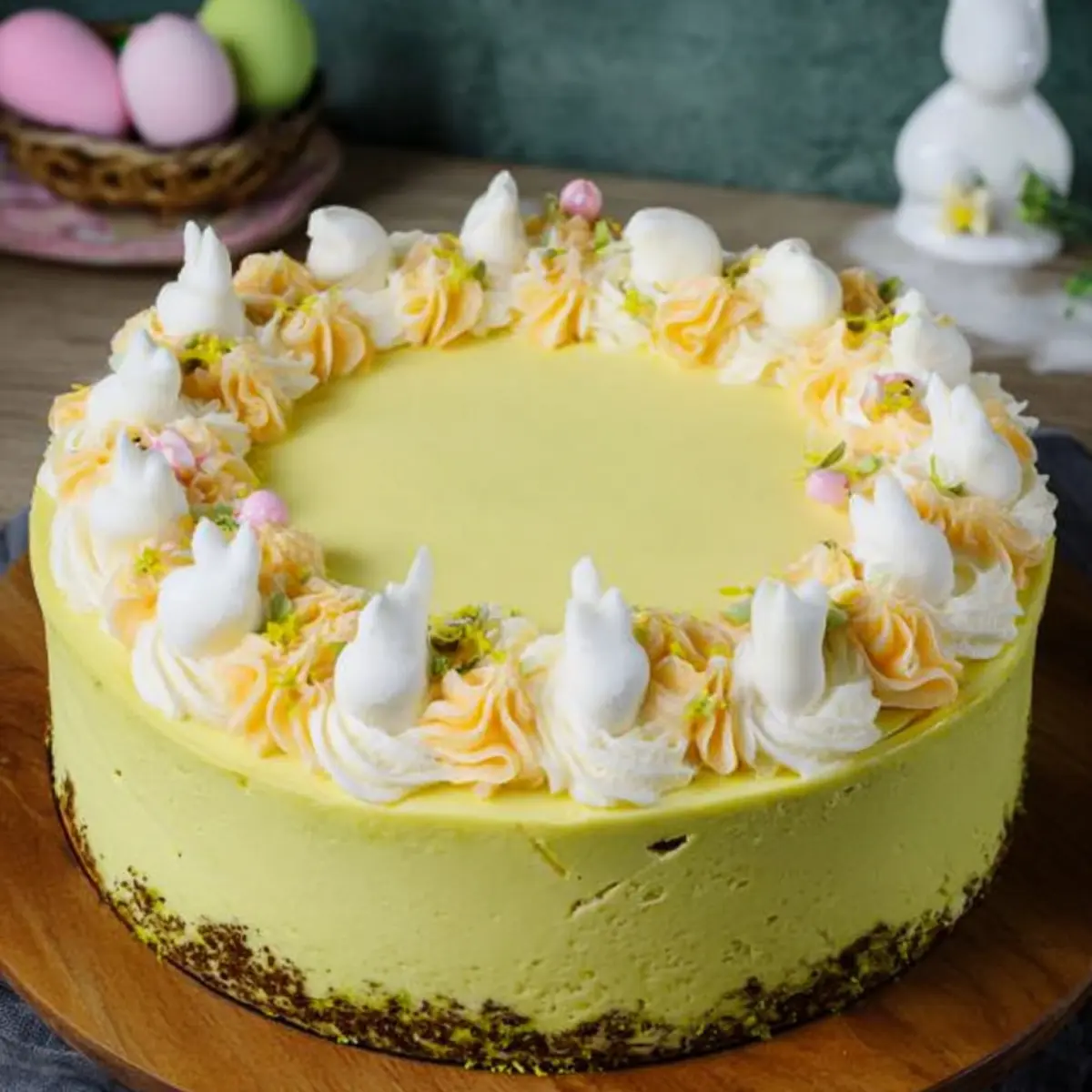 - Bestreiche die Torte damit und verziere die Torte mit Buttercreme-Rosen, Ostereiern und Pistazien.